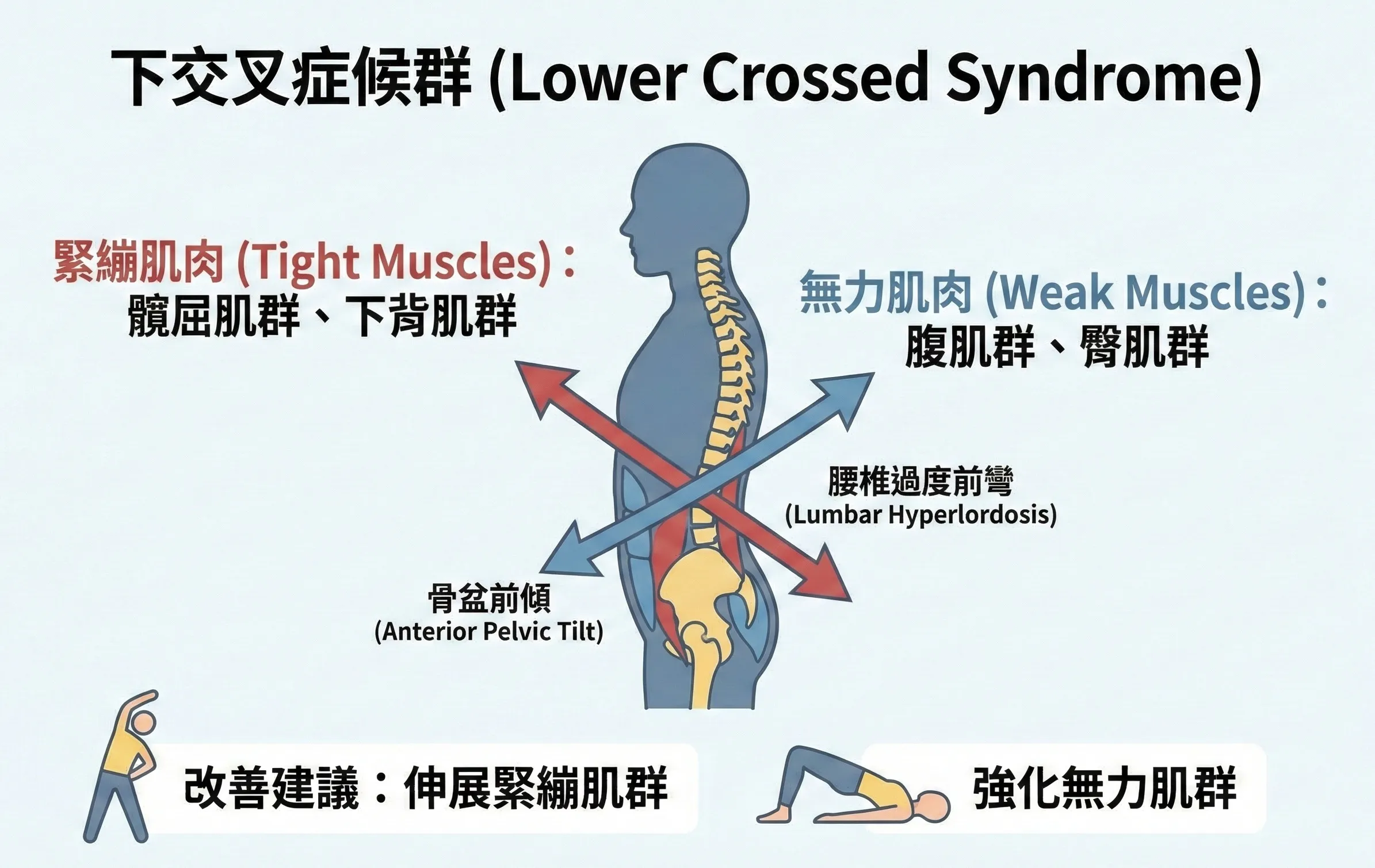 您是否總是有個消不下去的「小腹」?或者即使沒有做粗重的工作,只要久坐或久站,就會感到嚴重的腰痠背痛?如果符合上述情況,可能已經患上了現代人常見的文明病——下交叉症候群 (Lower Crossed Syndrome)。這篇文章將帶您了解什麼是下交叉症候群,以及如何透過日常調整與運動來改善它。